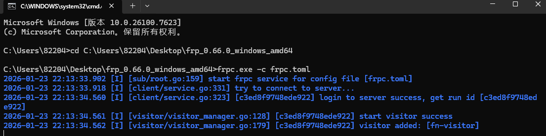 端口可随便改,改成命令行窗口cd到frp文件夹,运行frpc.exe -c frpc.toml
